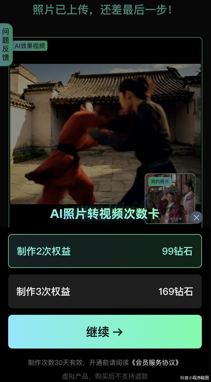 不过,网上依然有不少AI“魔改”视频教程。以“ai打架”为例,在某i平台上,还有能一键生成该效果的小程序。以某博主分享的“快颜”为例,北京商报记者通过分享口令进入发现,里面有“AI图生视频”“ai拥抱”“ai图片打斗”“ai图片跳舞”等多种效果。但其制作都需要充值才可享用,以“ai图片打斗”为例,制作2次权益需充值99钻石,制作3次权益需充值169钻石。