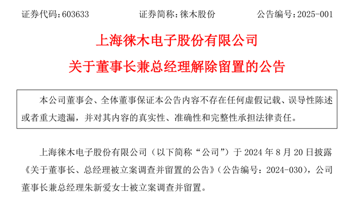 1月7日盘后,徕木股份(603633)公告,上海市虹口区监察委员会决定对公司董事长、总经理朱新爱女士解除留置措施。目前,朱新爱已能正常履行职责,公司生产经营管理情况正常。
