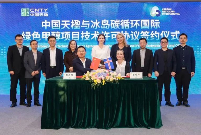 2024年 10月29日,冰岛碳循环国际公司(以下简称CRI)与中国天楹集团签署技术许可协议,中国天楹集团将运用CRI的专利技术,在吉林辽源建设中国首个大规模应用CRI二氧化碳制绿色甲醇的项目,项目首期工程绿色甲醇年产能将达17万吨。