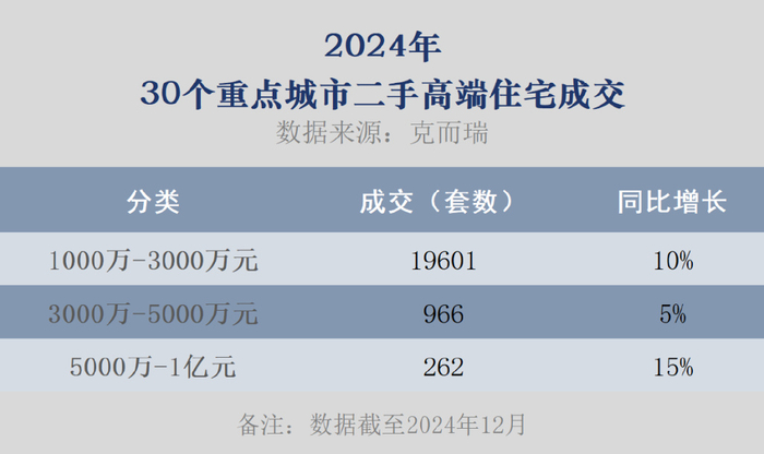 克而瑞数据显示,截至2024年12月,30个重点城市1000万~3000万元二手高端住宅成交19601套,同比增长10%;3000万~5000万元和5000万~1亿元总价住宅,分别同比增长5%、15%。