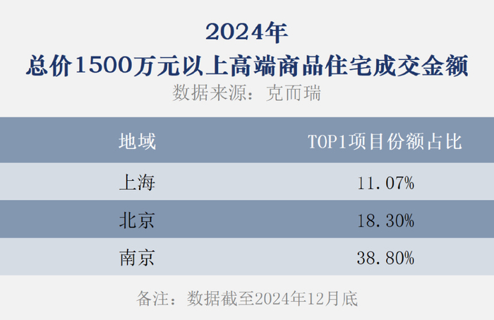 从全国典型城市豪宅的首位单盘份额来看,2024年1~12月总价1500万元以上高端商品住宅成交金额中,上海TOP1项目份额占比为11.07%,北京同级别项目的市场份额在18%左右,而南京千万级豪宅金额TOP 1项目金陵月华,占比份额近40%,远超一线城市中的领先项目。