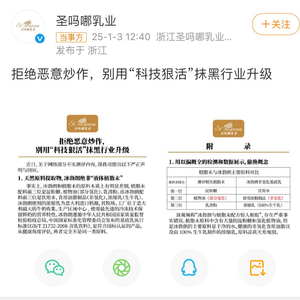 面对争议,1月5日晚,受到此次事件波及的品牌之一——霸王茶姬在其官方账号发布声明回应称冰勃朗是一种“含乳饮料”,执行相应的国家标准,并非植脂末。此外针对该博主所说的“科技乳”,霸王茶姬称冰勃朗是更健康的产品创新,“更狠”是误读。