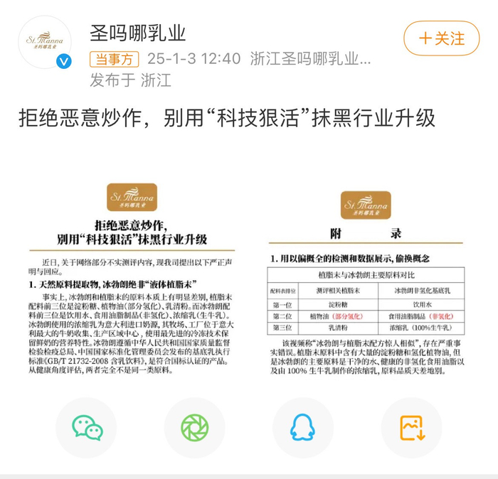 对此,1月3日,冰勃朗生产厂家浙江圣吗哪乳业有限公司(以下简称“圣吗哪乳业”)在其官方微博账号发布声明,强调冰勃朗与植脂末的原料本质上有明显差别。