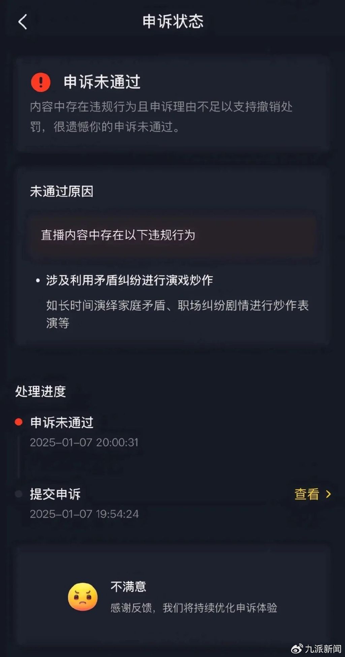 截图显示,申诉未通过原因为:涉及利用矛盾纠纷进行演习炒作,如长时间演绎家庭矛盾、职场纠纷剧情进行炒作表演等。