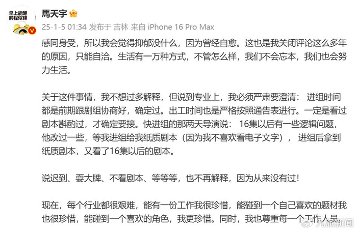 针对此事,马天宇发文:“希望大家能多多关注和关心抑郁患者以及狂躁症患者”随后又删除,并在1月5日凌晨发布长微博,否认迟到、耍大牌等指控。
