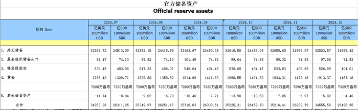 新华财经北京1月7日电(记者翟卓)国家外汇管理局7日发布的数据显示,截至2024年12月末,我国外汇储备规模为32024亿美元,较11月末下降635亿美元,降幅为1.94%;同期黄金储备报7329万盎司,为连续第二个月环比多增。