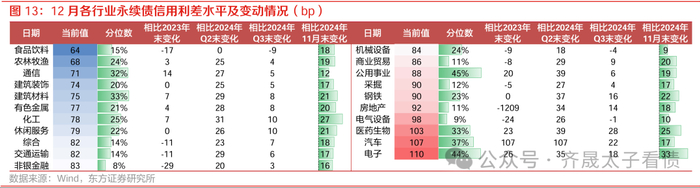 分行业看,12月各行业产业永续信用利差全面走阔。走阔幅度居前的行业有电子、化工和医药生物,分别走阔33bp、27bp和25bp,仅机械设备走阔幅度低于10bp,其余行业利差走阔幅度基本在16~20bp之间。