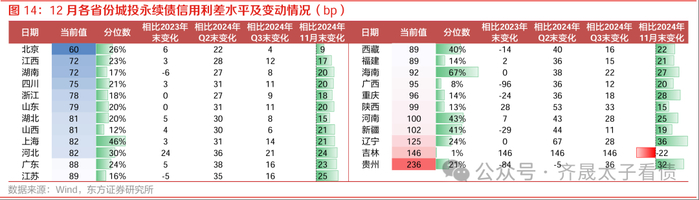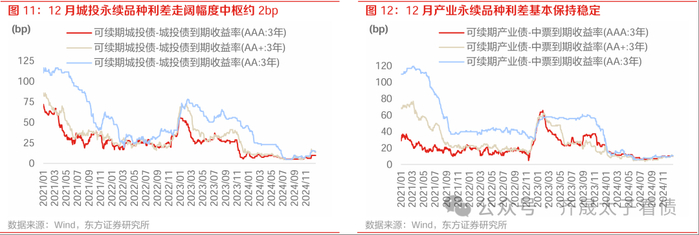 品种利差方面,12月城投永续品种利差均走阔,产业品种利差保持稳定。城投方面,各等级、各期限品种利差全面走阔,不同等级、期限间走阔幅度区别不大,中枢约2bp;产业品种利差环比变动不明显,AA级1Y利差最多走阔2bp,幅度整体低于城投,整体而言城投永续品种利差调整压力更大。