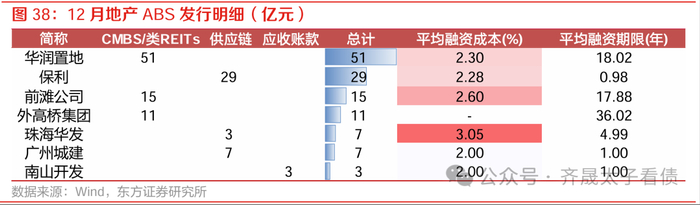 地产ABS方面,12月相关ABS发行量环比回升,合计发行124亿元,类型涉及CMBS和供应链等。其中华润置地最多发行51亿元,保利以29亿元次之,从融资成本看珠海华发偏高。