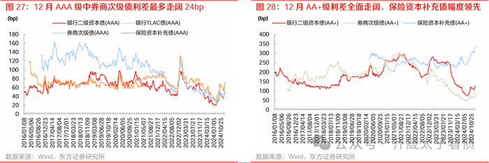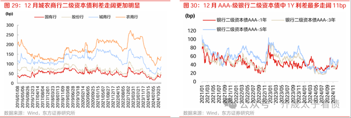 次级债方面,12月银行二级资本债利差全面走阔,农商行走阔趋势更明显。12月高等级主体利差均走阔,中枢约15bp,银行TLAC债相对稳定;AA+级次级债利差亦全面走阔,保险最多走阔27bp;分银行类型看,国股、城农商行利差均走阔且幅度相近;分期限看,与二级资本债类似,AAA-级银行二级资本债中1Y利差最多走阔11bp。