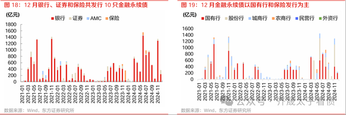金融永续债方面,12月发行量环比显著下滑,年末融资活跃度明显回落。12月共新发10单金融永续债,其中银行4单,证券公司4单,保险公司2单,融资规模共369亿元,发行规模在上月大幅上涨后明显回落,其中银行融资规模占比约65%,中行领衔融资200亿元,其余发行银行均为城商行且发行规模较小;平安人寿也发行150亿元永续债。同期到期规模共730亿元,最终累计净融出361亿元。