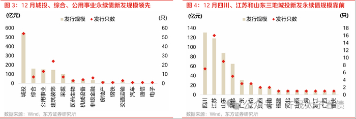 行业方面,12月发行量位居前三的行业为城投、综合、公用事业,建筑装饰被综合超越位居第四。城投永续共有15省新发,合计融资547亿元,四川超过江苏,融资规模最大达131亿元,江苏以119亿元位居第二,山东以88亿元居第三位,湖北以65亿元次之,其余省份均低于50亿元;截至12月末江苏城投存续规模达1537亿元居首,山东以1246亿元位居第二,四川、湖北分别以1104亿元和735亿元次之;综合行业融资 160亿元,其中中化股份大额融资110亿元;公用事业融资151亿元环比减半,主要靠国电投等电力央企拉动;建筑装饰行业融资147亿元环比缩减1/3,中交、中铁系发行活跃,地方国企融资意愿一般;采掘行业共发行102亿元,主要靠地方国企融资拉动,例如陕延油等;其余行业融资规模均在百亿元以内。