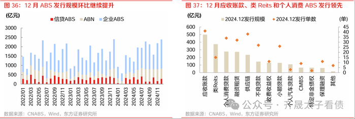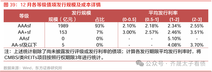 债项评级方面,12月ABS项目高等级仍占主体,AAAsf级债券发行规模占比93%,各等级发行成本环比全面下行,1Y以内最多收窄约20bp。