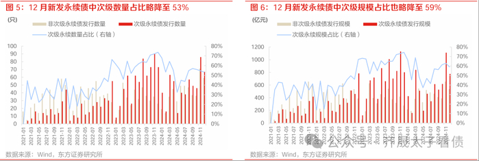 从企业永续债的次级属性来看,12月新发的126只企业永续债中属次级债的有67只、规模776亿元,只数占比环比小幅降至53%,规模占比也环比降至59%。分企业性质来看,12月央企新发40只永续债全部为次级永续债;地方国企新发次级、非次级分别为27只和58只,次级占比降至32%。