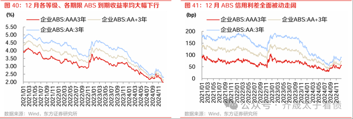 12月ABS到期收益率全面下行,各等级、各期限幅度均较大、分化有限,信用利差被动走阔。对比11月末,各等级、各期限ABS收益率均下行20bp以上,AA级5Y最多下行29bp;信用利差全面被动走阔,尤其是短端走阔幅度均在10bp以上,中长期限则在5~10bp之间。