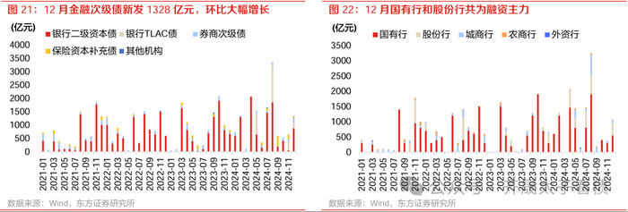 金融次级债发行量环比大幅增长,券商次级债发行仍活跃。12月金融次级债发行1328亿元,其中占比最大的为880亿元的银行二级资本债,其次是200亿元的银行TLAC债和185亿元券商次级债。具体来看,浦发银行、建行分别发行400亿元和350亿元银行二级资本债,约占本月金融次级债总发行量的一半;中行和工行各发行100亿元银行TLAC债,且发行利率相近;国泰君安证券、光大证券、兴业证券等7家券商新发185亿元券商次级债,环比明显提升,华安证券“24华安C4”融资成本最高仅2.30%;保险资本补充债共新发60亿元。同期合计到期264亿元,环比下降显著,最终实现高额净融入1064亿元。