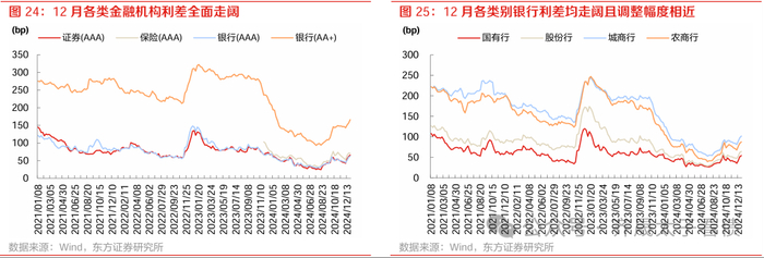 评级方面,12月AAA高等级主体发行规模占比环比小幅下滑,发行成本方面,AAA、AA+和AA的发行利率分别下行29bp、31bp和22bp至2.23%、2.58%和2.55%,在利率债的带动下一起快速下行。12月新债中2+N中票“24赣建工MTN004”和5+N公司债“24云港Y4”等4只票息超过3%,票息3%以上数量环比有所减少;低成本发债主体票息依然主要为建筑、电力等行业央国企,融资成本最低低至1.95%,下限环比压缩18bp。