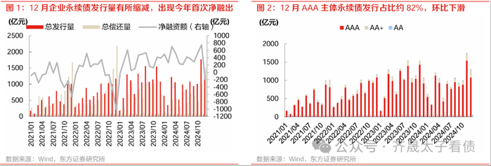 12月永续债发行量有所缩减,同期到期规模明显提升,最终出现2024年以来首次净融出。12月发行企业永续债126只,合计融资1311亿元,相较上月减少约26%;同时偿还规模增至1515亿元,环比扩大49%,最终出现净融出203亿元,为2024年首次净融出。