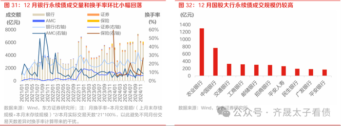 二级成交方面,12月银行永续债总成交规模和换手率环比小幅回落。银行、证券、AMC和保险永续债成交规模分别为5595亿元、175亿元、43亿元和328亿元,经修正后的月换手率分别为23.36%、6.43%、8.46%和27.02%,其中银行永续债换手率仍处年初以来较高水平。12月农业银行永续债最多成交1299亿元,平安人寿成交规模跻身前十。