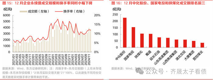 12月企业永续债成交规模和换手率面临下滑压力。12月企业永续债全月共成交3727亿元,环比下降5%,剔除交易天数差异修正后的换手率为11.93%,环比下降0.24pct,换手率在持续上升后小幅下滑。分行业看,城投、公用事业和综合成交额位居前三,城投环比增10%,公用事业环比下滑20%。从主体层面看,中化股份、国家电投和陕煤化成交额排名前三。