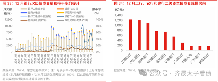 次级债方面,12月银行二级资本债成交规模与换手率均明显提升。银行二级资本债、银行TLAC债、券商次级债和保险资本补充债成交规模分别为7606亿元、388亿元、240亿元和499亿元,修正后的月换手率分别为19.28%、33.99%、7.92%和15.85%,除银行TLAC债外其余类别成交规模与换手率全面提升。工行、农行和建行二级资本债成交规模位列前三。