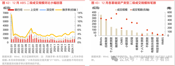 12月ABS二级成交热度小幅回落,应收账款ABS成交量环比提高最多。12月二级成交规模共计1452亿元,环比缩减7%,在抹平交易天数差异后,换手率环比下滑0.17pct至4.88%,为年内次高水平。分基础资产看,成交额前三大品种依然为类Reits、应收账款和个人消费贷款ABS,应收账款ABS成交量环比最多提升29%。折价成交方面,以成交净价/全价偏离中债估价净价/全价来计算折价幅度,本月未发现有主体的ABS出现大量折价成交。