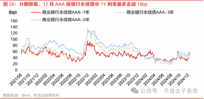 永续债方面,12月各机构利差全面走阔,证券和AA+银行调整幅度更大。具体而言,本月各机构、各等级利差全面走阔,AAA级证券利差最多走阔21bp,其余走阔幅度集中在15~19bp;分银行类型看,各类别银行利差亦全面走阔且幅度相近,都在16bp左右;分期限看,12月AAA-级内短期限利差走阔更明显,1Y利差最多走阔18bp。