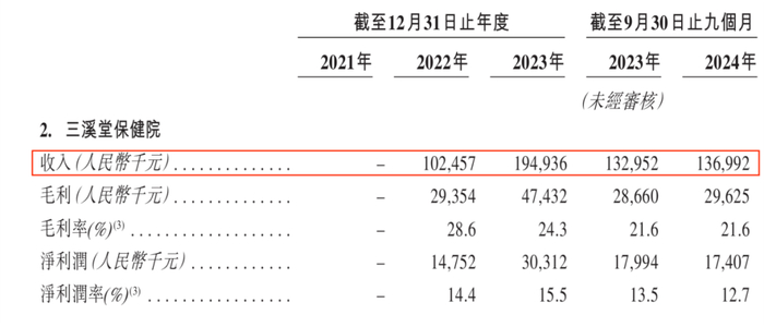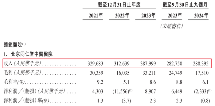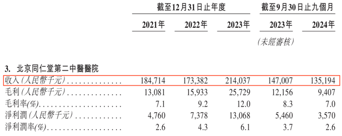 「创业最前线」梳理发现,于报告期内(2021年至2024年前9月),同仁堂医养旗下年收入过亿的医院只有3家,分别是北京同仁堂中医医院、三溪堂保健院及北京同仁堂第二中医医院。