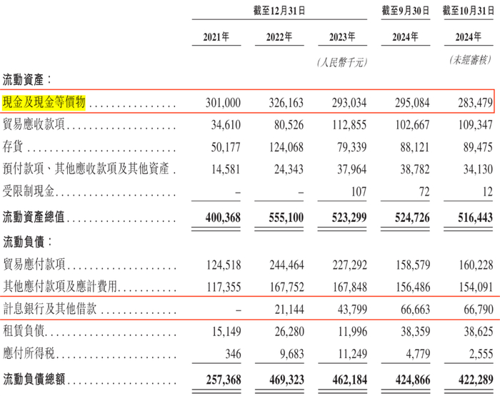 招股书显示,截至2024年10月31日,公司现金及现金等价物为2.83亿元、短期计息银行及其他借款6679万元。