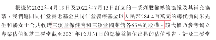 除此之外,在2024年3月增资之时,同仁堂医养还获得了三溪堂保健院31.26%股权、三溪堂国药馆31.25%股权、粹和药店100%股权。