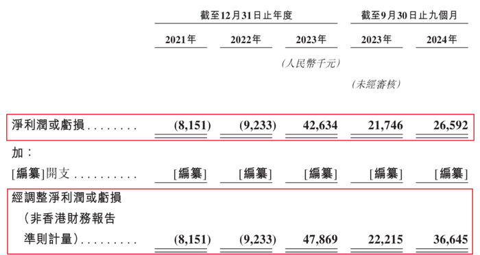 2021年至2024年前9月,公司净利润分别为-815.1万元、-923.3万元、4263.4万元、2659.2万元;经调整净利润分别为-815.1万元、-923.3万元、4786.9万元、3664.5万元。