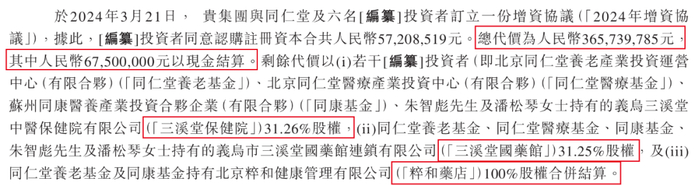在公司首次递表港交所之前,股东又进行了一轮增资。2024年3月,同仁堂医养与同仁堂集团以及同仁堂养老基金、同仁堂医疗基金、同康基金、同清基金、朱智彪及潘松琴6名投资者签订增资协议。
