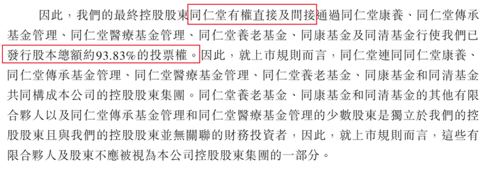 在此之前,同仁堂、同仁堂科技(H股)、同仁堂国药(H股)均在2014年前完成上市,而同仁堂医养就是即将打造的第四个上市平台。IPO前,同仁堂集团直接及间接控制同仁堂医养约93.83%的投票权。