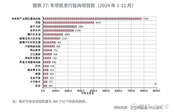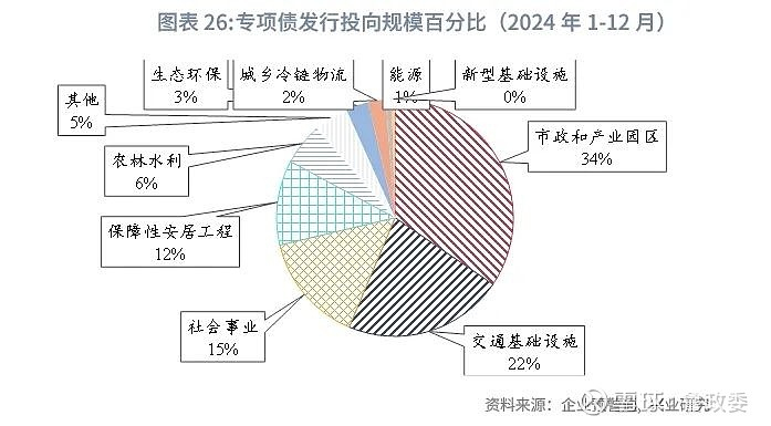 从全国新增专项债投向来看,截至2024年12月末,新增专项债投向较为集中,前四类投向主要为:市政及产业园区的建设、交通基础设施、社会事业、保障性安居工程。新增规模分别为10767、6819、4665、3605亿元,占比分别达34.0%、22.0%、15.0%、12.0%,而冷链物流、能源、新型基础设施等类别规模较少,占比仅为2.4%、0.8%、0.4%。