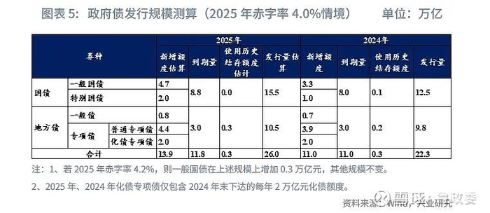 截至2024年12月末,全国限额内剩余额度约1.2万亿元,其中,一般债剩余0.5万亿元,专项债剩余0.7万亿元。为方便衡量年内情况,限额计算时暂不加入已下达的2025-2026年的新增化债额度4万亿元。