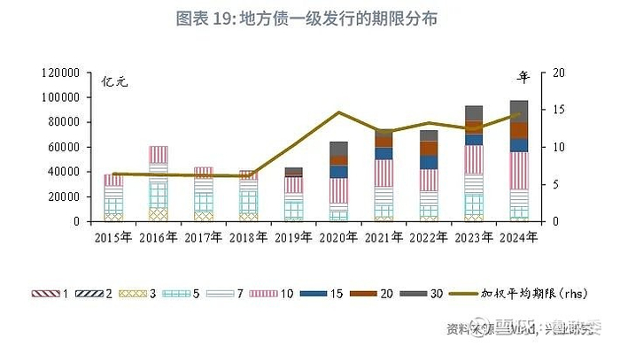 从发行期限分布来看,2024年的地方债发行加权平均期限为14.4年,较2023年延长2.0年。10年期以上的超长地方债的发行占比为42.7%,相较2023年的占比上升8.6个百分点;10年期及以下限期中,5年期地方债的占比明显下降,由2023年的17.0%缩减至2024年的9.3%,降低了7.7个百分点。