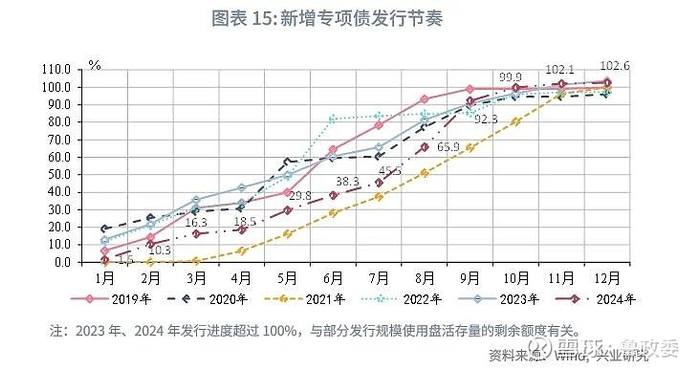 从地方债的发行节奏来看,2024年新增专项债发行节奏略有后置。新增地方债发行在第一、二季度较慢,第三、四季度明显加快。主要原因在于:一是对于地方债特别是专项债项目的审核较为严格,第一、二季度发行节奏较历史同期晚2个月左右;二是7月30日政治局会议强调加强逆周期调节,“要加快专项债发行使用进度”,加大政策力度,新增地方债显著放量;三是2024年年内新增化债额度2万亿元,11-12月主要发行用于化债的再融资债券。11月8日新闻发布会披露:“增加6万亿元地方政府债务限额置换存量隐性债务。……新增债务限额全部安排为专项债务限额,一次报批,分三年实施。”四是部分结存额度作为补充。据财政部披露,“中央财政从地方政府债务结存限额中安排了4000亿元,补充地方政府综合财力,支持地方化解存量政府投资项目债务和消化政府拖欠企业账款”。