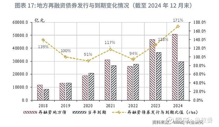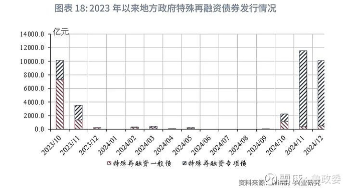从特殊再融资债券规模来看,目前此前下达的年内化债额度基本使用完毕。截至2024年12月末,在化债额度2万亿元的补充下,再融资债券发行与到期比值为171%。11月8日,十四届全国人大常委会披露“增加6万亿地方政府债务限额置换存量隐性债务”。对应2024年预计约2万亿元用于化债的再融资债券,主要在11月-12月发行,2024年11月、12月特殊再融资债券发行规模分别为863亿元、20791亿元。