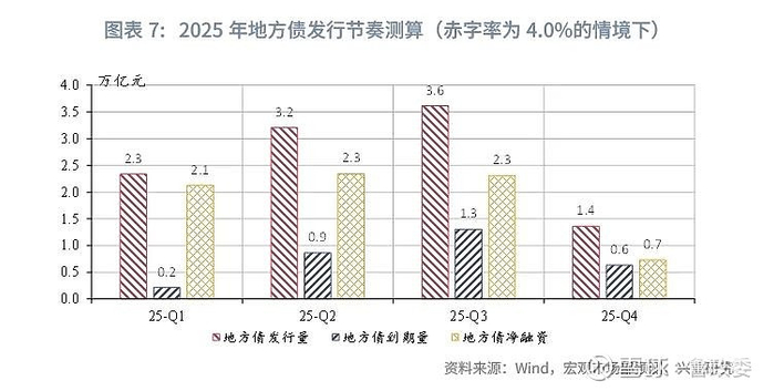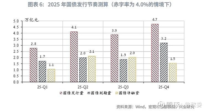 从供给规模与发行节奏来看,全年供给规模方面,在赤字率4.0%的情境下,政府债发行规模可能达到26.0万亿元,较2024年增加约3.8万亿元;政府债净融资规模可能达到14.2万亿元,较2024年增加约3.0万亿元。第一季度供给规模方面,政府债发行规模可能达到5.1万亿元,净融资规模3.2万亿元。其中,国债发行规模2.8万亿元,净融资规模1.1万亿元;地方债发行规模2.3万亿元,净融资规模为2.1万亿元。