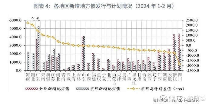 从计划发行与实际发行差异来看,2024年1-12月新增地方债实际发行规模高于计划发行规模约556亿元。可见,计划发行规模总体及节奏可作为大致参考,实际发行情况由于各地披露时间与下达额度、期间调整均有关,因此实际与计划会有一定差异。2024年1-12月部分省市差异较大,其中,四川、浙江、安徽、湖南、江西等地实际发行低于计划发行,差额超过500亿元;河南、湖北、广东、云南等地实际发行高于计划发行,差额超过1000亿元。