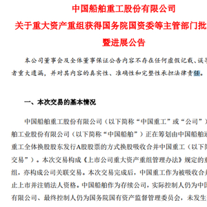 2024年9月19日,中国船舶披露重大资产重组预案,拟通过换股吸收合并中国重工,完成后中国重工将终止上市并注销法人资格,中国船舶成为存续公司。根据双方已披露的预案,此次换股合并中,中国船舶的换股价格为37.84元/股,中国重工的股票交易均价确定为5.05元/股,预计交易总价将超1100亿元。