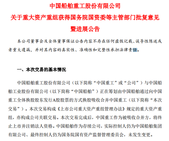 2024年9月19日,中国船舶披露重大资产重组预案,拟通过换股吸收合并中国重工,完成后中国重工将终止上市并注销法人资格,中国船舶成为存续公司。根据双方已披露的预案,此次换股合并中,中国船舶的换股价格为37.84元/股,中国重工的股票交易均价确定为5.05元/股,预计交易总价将超1100亿元。