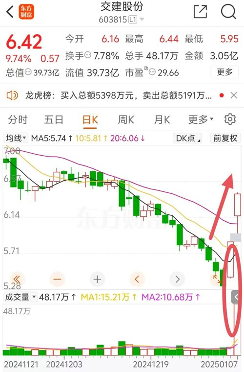 在公告发布之前,1月6日和1月7日,交建股份股价已经放量大涨,其中,1月6日开盘快速冲上涨停,1月7日则盘中冲击涨停,收盘涨幅达到9.74%。