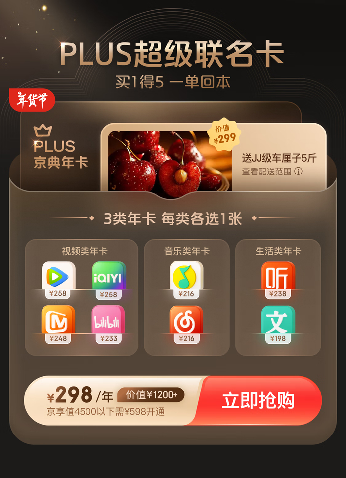 在1月8日京东PLUS会员权益重磅升级之际,京东PLUS年度盛典活动也正式开启。在此次PLUS年度盛典上,京东PLUS会员联合腾讯视频、网易云音乐等热门品牌推出超级联名卡,于1月8日早上10点正式开售。用户只需298元即可抢购总价值超1200元的超级联名卡,其中包含1张京东PLUS会员京典卡、价值299元的5斤JJ车厘子,以及腾讯视频、爱奇艺、B站、芒果TV视频会员年卡任选其一,网易云音乐、QQ音乐音频会员年卡任选其一,百度文库、喜马拉雅生活会员年卡任选其一,一张卡即可全方位满足用户购物、追剧、听歌等需求。