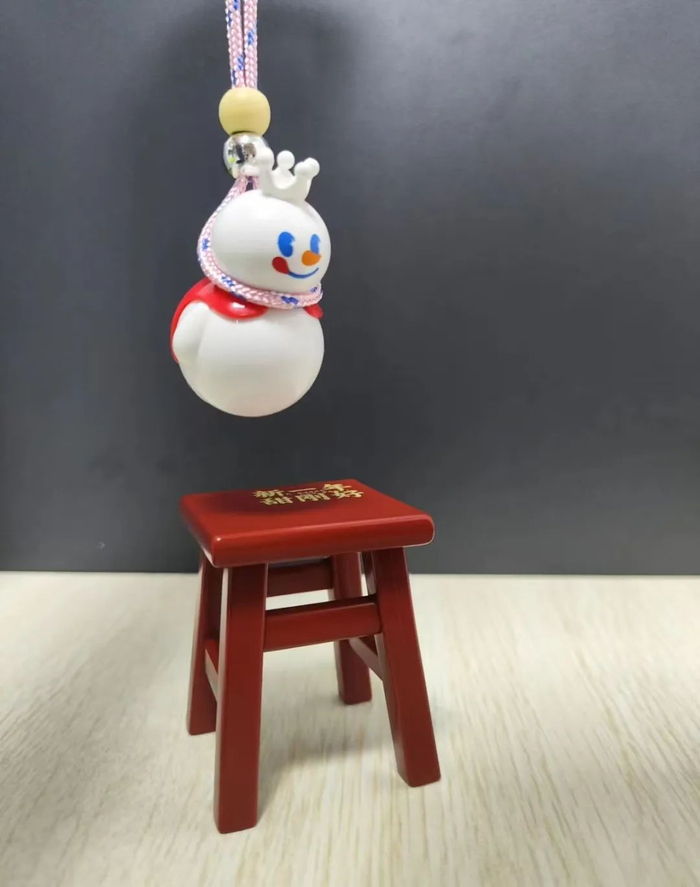 不少用户拿到挂件之后,突然想起了蜜雪冰城,将雪王玩偶吊在绳子上,下方则摆上了小板凳。
