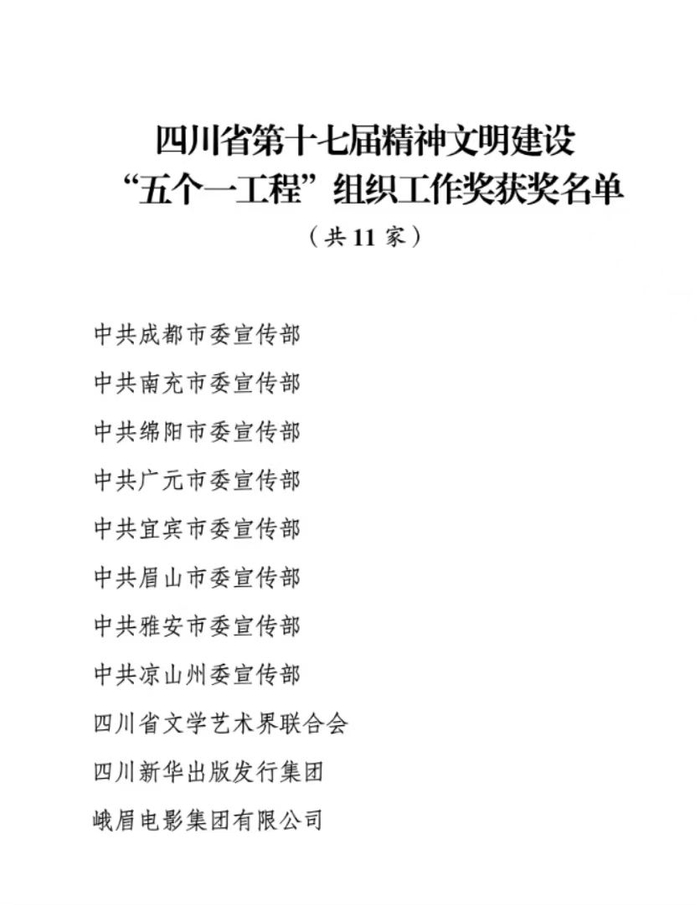 日前,中共四川省委宣传部发布“关于表彰四川省第十七届精神文明建设‘五个一工程’组织工作先进单位和优秀作品的决定”。成都市委宣传部等11家单位获四川省第十七届精神文明建设“五个一工程”组织工作奖。图书《何以中华:一百件文物中的中华民族共同体历史记忆》等3部/首作品获四川省第十七届精神文明建设“五个一工程”特别奖。此外,45部/首/篇作品获四川省第十七届精神文明建设“五个一工程”优秀作品奖。