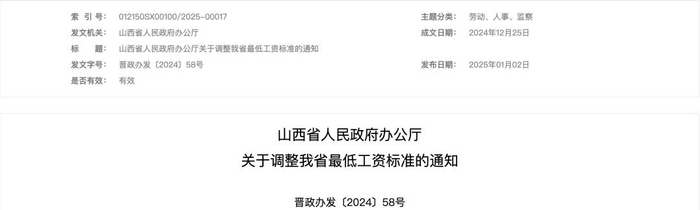 山西省人民政府办公厅发布了《关于调整我省最低工资标准的通知》,明确自2025年1月1日起,调整最低工资标准。