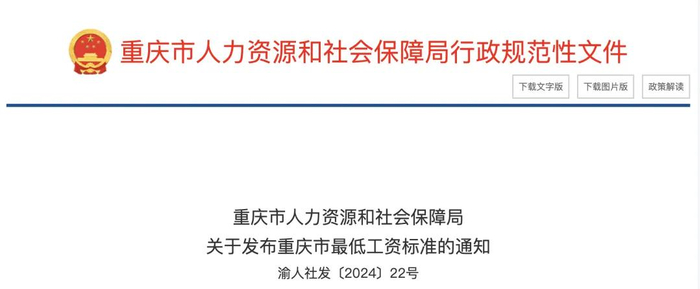 2024年12月31日,重庆市人社局发布《关于发布重庆市最低工资标准的通知》(以下简称《通知》)。《通知》明确,从2025年1月1日起,调整重庆最低工资标准。