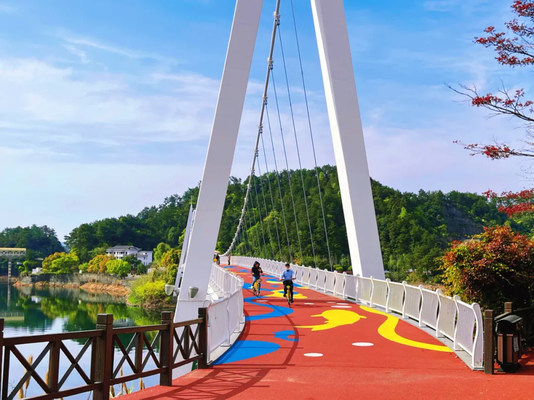 骑行桥是国内第一座骑行悬索桥,全长168米,位于浙江最美公路淳杨线上,是千岛湖环湖绿道骑行的一个标志性建筑。