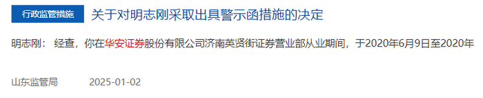 2025年刚开年,华安证券及相关人员便接连收到监管函。1月2日,山东证监局在其官网披露了《对明志刚采取出具警示函措施的决定》。